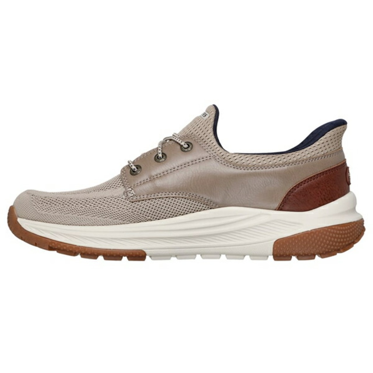 エンジニアードメッシュと人工皮革のオーバーレイ付きアッパー、固定ストレッチレース、炭入りSkechers Air-Cooled Memory Foam(スケッチャーズ エアクールドメモリーフォーム)インソール、濡れた路面でも乾いた路面でも滑りにくいGoodyear(グッドイヤー)ラバーアウトソールが特長です。