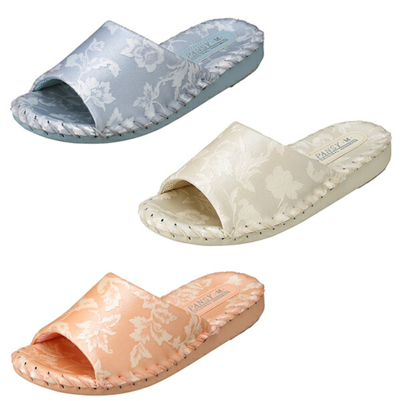 ワンランク上の上品なお部屋履き。優しいカラーと立体的なお花模様が足元を彩ります。足の形状に添うように作られたインソールはフィット感も歩き心地もバツグンです。