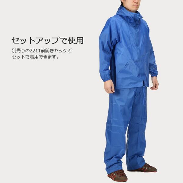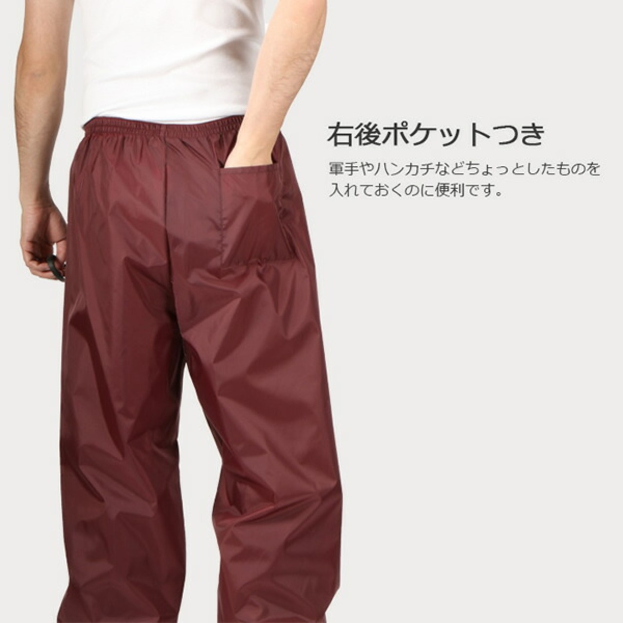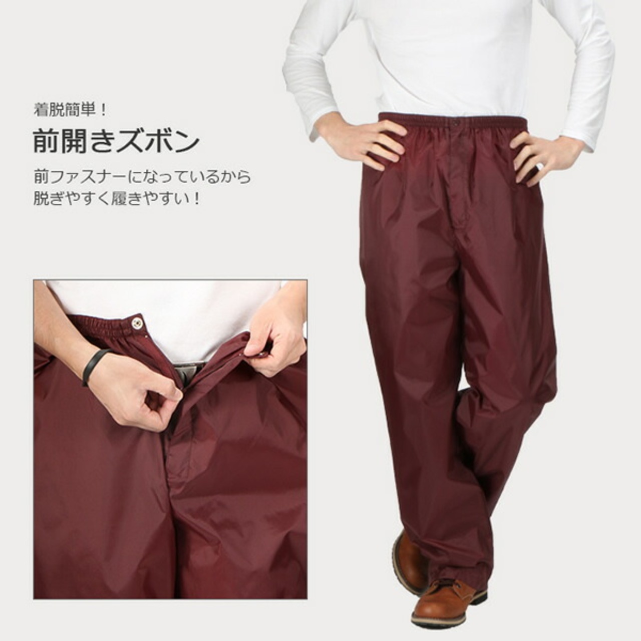 前開きヤッケとセットで着用できるパンツ。前ファスナー付きで着脱が容易。※防水性はないのでカッパとしての使用はできません。